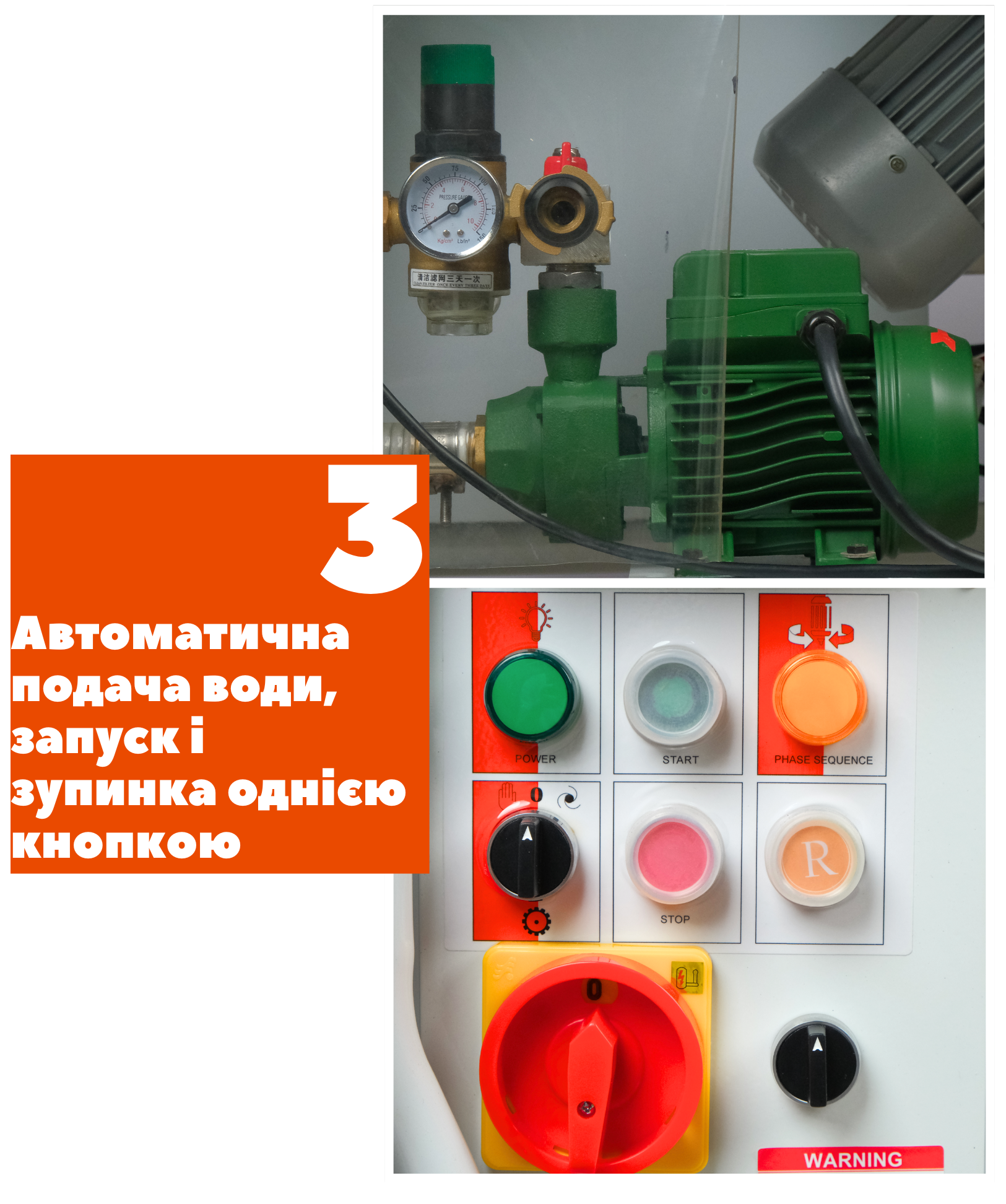 Автоматичне регулювання рівня води та подача, зручний запуск і зупинка одним натисканням кнопки. Це дозволяє заощадити час і мінімізувати зусилля.